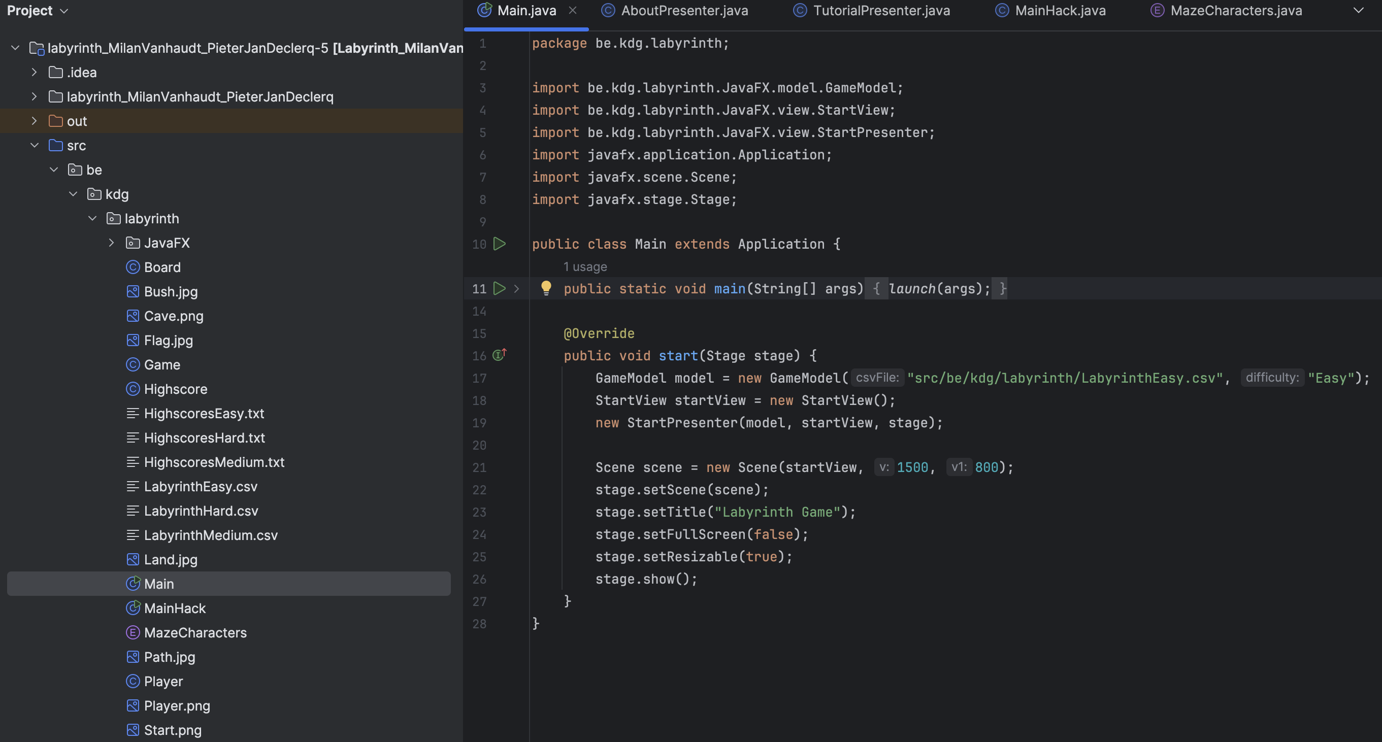 Een interactief labyrinth spel ontwikkeld in JavaFX waarbij spelers door een doolhof moeten navigeren. Het spel bevat verschillende levels, secrets en een score systeem.